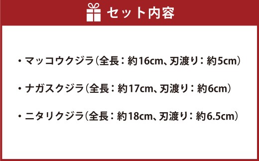 このセットでは、そのシリーズの中でも特に人気の高い「マッコウクジラナイフ」、「ナガスクジラナイフ」、「ニタリクジラナイフ」の3種類をセットにしています。