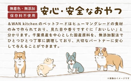 千葉県産を中心とした国産原料を無添加製法で調理しており、大切なパートナーに安心して与えることができます。
