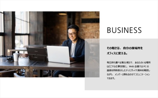 Usability 使いやすい:本体一体型のスタンドで設置角度(無段階:16~75°)を自在に調整でき、スペースに応じた最適な角度で設置できます。USB Type-Cケーブル1本で投影/給電ができ、PCやスマートフォン画面の拡張複製をして作業が可能です。薄型のため、スペースが限られた場所でも邪魔になりません。