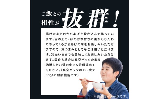 揚げたあとのからあげを炊き込んで作っています。ご飯との相性が抜群です。舌の上で、ほのかな甘さの後からじんわりやってくるからあげの味をお楽しみいただけますので、おつまみとしてもご活用いただけます。冷たいままでも美味しくお楽しみいただけます。温める場合は真空パックのまま沸騰したお湯の中で5分程温めてください。(真空パックは100度で30分の耐熱機能です)