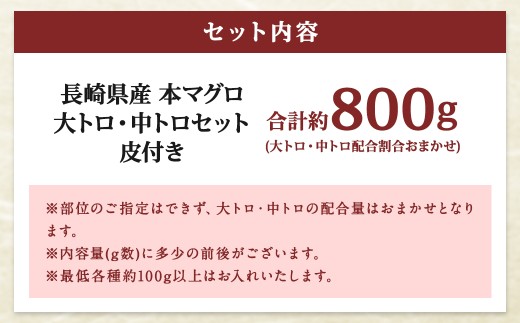 - 【ふるさと納税】訳あり 長崎県産 本マグロ 大トロ・中トロセット 皮付き 部位おまかせ 計約800g お魚 魚 まぐろ マグロ 鮪 トロ 大トロ 中トロ 養殖 国産 冷凍 お刺身 刺し身 刺身 赤身 800g セット 詰め合わせ おまかせ