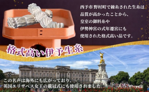 西予市野村町で繰糸された生糸は、品質が高かったことから、皇室の御料糸や伊勢神宮の式年遷宮にも使用された格式高い品です。また、この名声は海外にも広がっており、英国エリザベス女王の戴冠式にも使用されました。