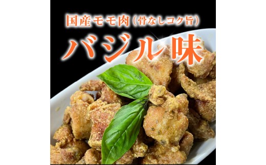 鶏肉(国産)、にんにく(国産)、しょうが(国産)、醤油(国産)、バジルソース、塩、コショウ、唐辛子、ごま、でんぷん、油、(原材料の一部に大豆、小麦を含む)