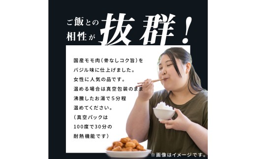 国産モモ肉(骨なしコク旨)をバジル味に仕上げました。女性に人気の品です。温める場合は真空包装のまま沸騰したお湯で5分程温めてください。(真空パックは100度で30分の耐熱機能です)