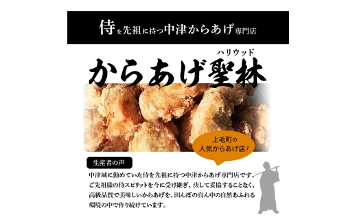 中津城に勤めていた侍を先祖に持つ中津からあげ専門店です。ご先祖様の侍スピリットを今に受け継ぎ、決して妥協することなく、高級品質で美味しいからあげを、田んぼの真ん中の自然あふれる環境の中で作り続けています。貯蔵庫でモーツアルトを聴かせて熟成させ、愛情込めて作り出すからあげは、他店と一線を画すB級グルメではない高級品質、聖林品質(ハリウッドクオリティ)です。
