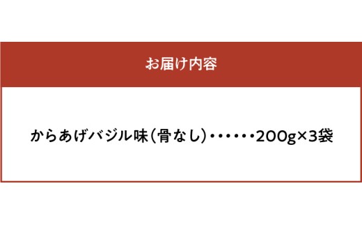 聖林本店 コク旨 バジル からあげ 200g × 3袋 国産 鶏肉 モモ肉 骨なし 中津からあげ からあげ専門店 湯煎 ボイル 温めるだけ 真空パック 時短 簡単調理 おかず お弁当 冷蔵 お取り寄せ 福岡県 上毛町 送料無料