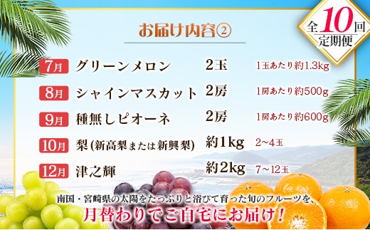 - 【10回定期便】旬 人気 フルーツ 南国宮崎産 マンゴー 金柑たまたま シャインマスカット ピオーネ いちご みかん 梨 メロン 柑橘 きんかん ぶどう 果物 詰め合わせ 宮崎県 九州<E-2コース M600>
