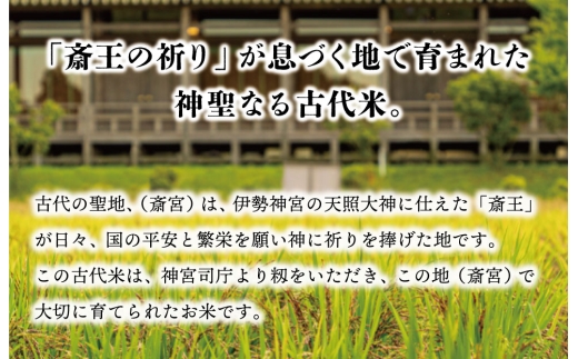 この古代米は、神宮司庁より、籾をいただきこの地、斎宮で大切に育てられたお米です。