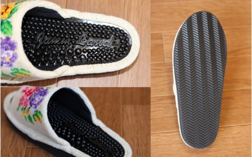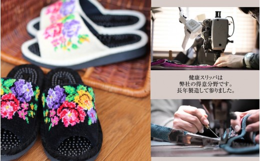 シュニールテープを使った健康スリッパも当社では作っていますが、こちらは甲部分が大きな柄になっているため、より上品な印象の商品になっております。
