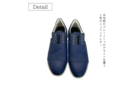 外羽根のプレーントゥのデザインを覆う1枚のシュリンクレザーが特徴。また、シューレースの代わりに甲ゴムを使用することで脱ぎ履きのし易さがUP。全面にソフトシュリンクレザーを採用し、ライニングにはスニーカーの部類としては贅沢なピッグレザー(通気性に良い)を全体に使用しています。表面に見える太いステッチは全てハンドメイドで編み込んでいます。ソールのグリップ性能は、スタッドレスタイヤの形状を利用している為、雨の日には滑りにくくなっています*1。また、カップインソールにおいては、従来のEVAスポンジからウレタンスポンジを使用することによりクッション性能の持続力がUPされ着地時の衝撃を吸収します。 1歩行状況によっては、まったく滑らないということではありません。個人差がございますので歩行には十分にご注意下さい。