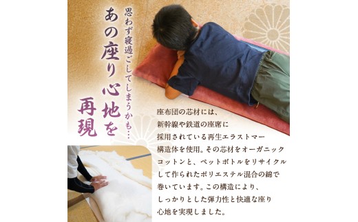 座布団生地・中綿:綿70% 再生ポリエステル30% 座布団構造材:再生エラストマー カバー:ポリエステル非溶融繊維混紡糸、ポリエステルレーヨン混紡糸
