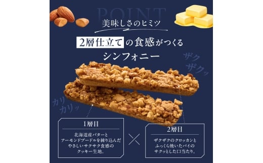 1層目はやさしいサクサク食感のアーモンド香るクッキー。2層目はクロッカンとパイが奏でるザクザク、カリカリ、サクサク食感。