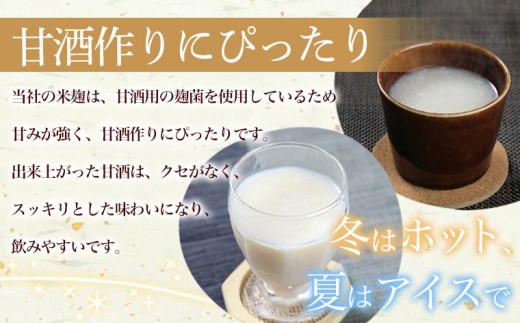 当社の米麹は、甘酒用の麹菌を使用しているため甘みが強く、甘酒作りにぴったり!出来上がった甘酒は、クセがなく、スッキリとした味わいになり、飲みやすいです。