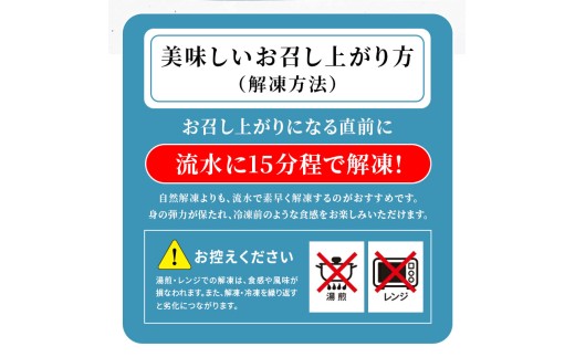 袋のまま流水で約15分または冷蔵庫で半日ほど解凍。新鮮な味わいをそのままお楽しみいただけます。
