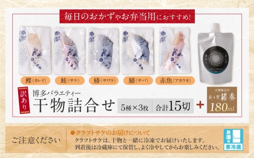 - W61-179 博多バラエティ― 干物詰合せ(15切)&クラフトサケ「緒奏」(180ml)セット 魚 海鮮 魚介干物 ひもの 魚 海鮮 魚介 銀鰈 鮭 さけ 鰆 さわら 鯖 さば 赤魚 あかうお 詰め合わせセット ギフト 贈答 おかず おつまみ 酒 お酒 セット 詰め合わせ ★レビューキャンペーン開催★