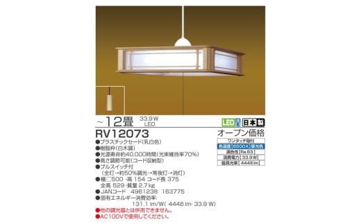 - 【RV12073】 12畳 LED和風ペンダント 調光 日本製 照明 簡単 便利 ライト 天井 寝室 和室 TAKIZUMI 瀧住電機工業