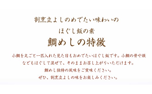 鯛の豊かな風味が米一粒一粒にしっかりと染みわたり、鯛を余すところなく楽しめる贅沢な炊き込みご飯の素です。骨は柔らかく気にならず、安心してお召し上がりいただけます。