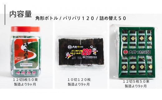 | 容量 | ・大野海苔角型ボトル1(12切れ5枚入り50束)  |