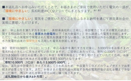 ・本返礼品へお申込みいただくことで、お客さまのご家庭で使用いただく電気の一部が、「環境にやさしい」長和町産のCO2フリーでんきとなります。(申込条件・注意事項等必ずご確認ください)