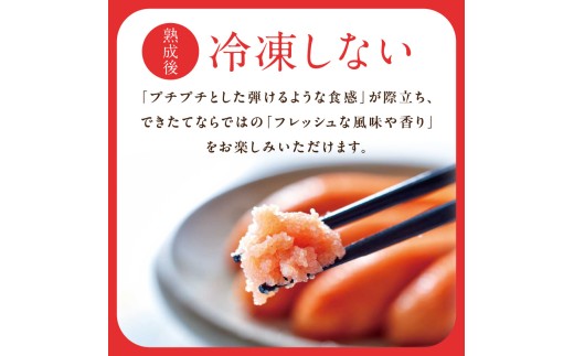 一般的な明太子は漬け上がり後、一度冷凍保管されますが、この「できたてめんたい」は、168時間じっくり熟成したあと一度も冷凍することなくお届けする明太子です。