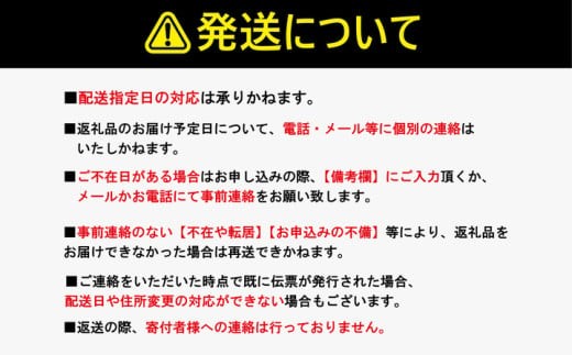 ご用意ができ次第、順番に発送いたします。 ※日付指定は承れません。 ※沖縄県・離島への配送は不可となります。 ※同じ商品を複数お申し込みの場合でも、配送日の指定は承れません。 ※寄付者様都合での再送、返品は承れませんので、ご理解の上お選びください。 ※寄附者様のご都合(不在・受取拒否)により商品を受け取らなかった場合、または受取までに期間がかかった場合につきましては転送・再発送は致しかねますのでご了承ください。 ※長期不在期間がある場合は必ず注文時にメモ・備考欄へご記載ください。 |