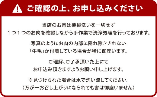 写真のようにお肉の内部に隠れ除ききれない「牛毛」が付着している場合が稀に御座います。