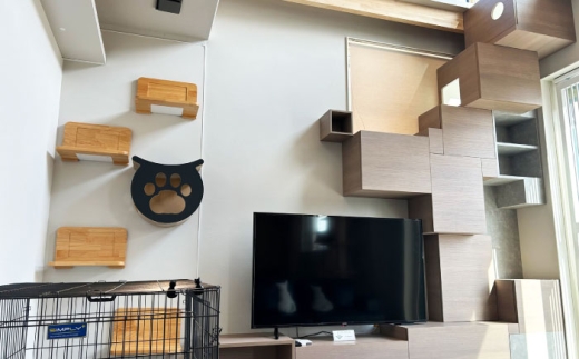 天井まで伸びる大きなキャットタワー、見晴らしの良いキャットウォークなど、愛猫が心ゆくまで遊びまわる姿を眺めながら、ゆったりとした特別な時間をお過ごしいただけます。
