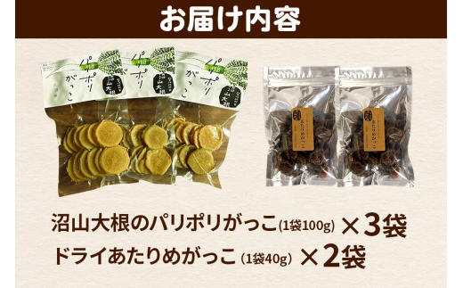 漬物 あきた伝統野菜「沼山大根のパリポリがっこ」3袋&ドライにしたらあたりめみたいに噛めば噛むほど味がでる「あたりめがっこ」2袋の計5袋セット
