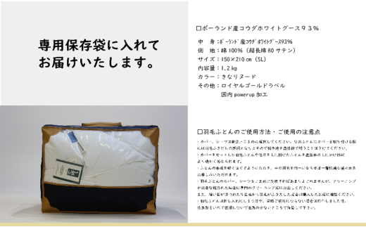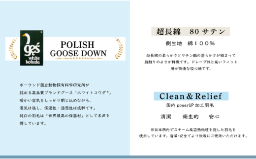 サイズ:150×210cm 重量:1.2kg 側生地:綿100%(超長綿80サテン) 中身:ポーランド産コウダホワイトグース93%(ダウンパワー400dp以上)日本製 |