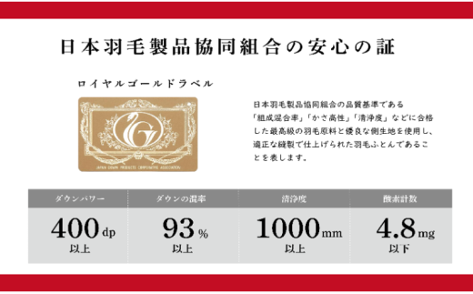 こちらの羽毛ふとんは、世界的に高品質とされるポーランド産「コウダホワイトグース」ダウンを贅沢に93%使用。たっぷり1.2kgのダウンが詰まっているのに、驚くほど軽やか。ダウンパワーは400dp、上質なロイヤルゴールドラベル付きの一級品です。