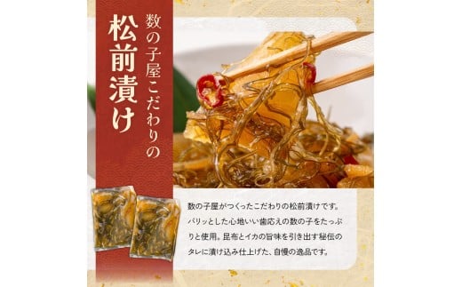 数の子をふんだんに使用し、昆布とイカの旨味を引き出す秘伝のタレに漬け込みました。