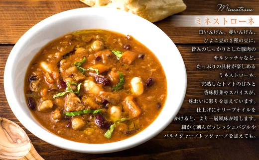 白いんげん、赤いんげん、ひよこ豆の3種の豆に、旨みのしっかりとした豚肉のサルシッチャなど、たっぷりの具材が楽しめるミネストローネ。