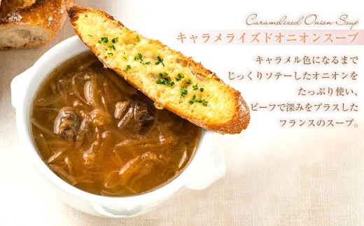 キャラメル色になるまでじっくりソテーしたオニオンをたっぷり使い、ビーフで深みをプラスしたフランスのスープ。