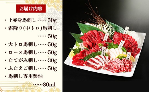 馬肉 馬刺 上赤身 霜降り 大トロ たてがみ ふたえご ロース 各50g 計300g 小分け 食べ比べ おつまみ 晩酌 冷凍 ブロック 醤油付き 国産 国内産 熊本県 甲佐町