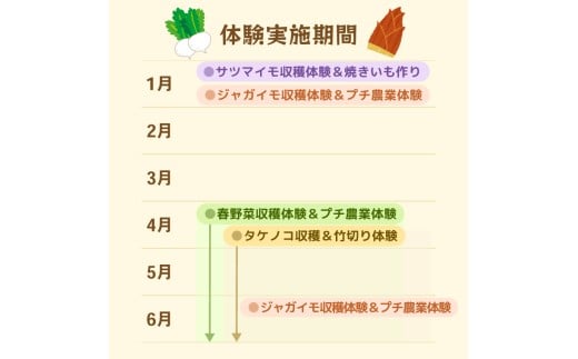 ・体験日程とご予定が合わない場合は、「サツマイモ収穫体験&焼きいも作り」「春野菜収穫体験&プチ農業体験」「竹炭作り&竹切り体験」「タケノコ収穫体験&竹切り体験」「ジャガイモ収穫体験&プチ農業体験」から変更可能です。変更される場合はHP記載の連絡先からお問い合わせください。(変更は1回のみ可)