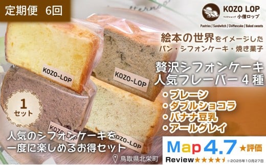 - 1244.【定期便6ヶ月】鳥取県産 シフォンケーキ 人気フレーバー4種 プレーン・ダブルショコラ・バナナ豆乳・アールグレイ 1セット 6回