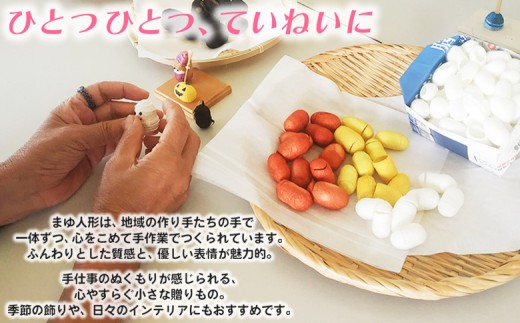 西予産繭を使って作るまゆ人形です。 ひとつひとつ心を込めて手作業で作りました。
