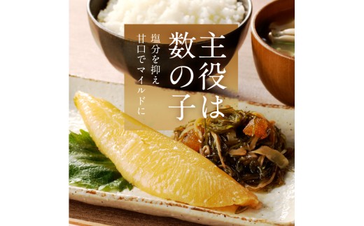 塩分を控えた甘口仕立ての味付けが、数の子本来の旨みをやさしく引き立てます。