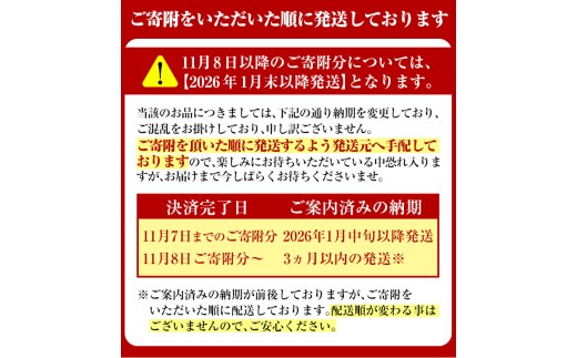 入金確認後、3ヵ月以内の発送となります 配送日時の指定は出来かねますので、ご了承くださいませ。 ※お申込みが集中した場合や、年末年始(11月~翌年2月)を含む繁忙期には、通常よりもお届けまでにお時間をいただく場合がございます。あらかじめご了承ください。 |