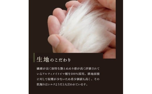 コットン100%でありながらシルクの様ななめらかさを実現しています。このなめらかな生地は摩擦によるダメージを軽減するだけでなく、他社にはない極上の着心地を確立しました。
