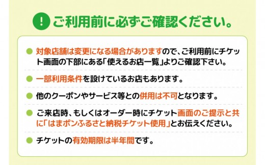 入店時、もしくはオーダー時にスマホのチケット画面を提示し「はまポンふるさと納税ご利用」の旨をお伝えください。