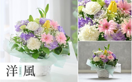 季節の花々を丁寧にアレンジした、心を込めたお供え用フラワーアレンジメントLサイズを3ヶ月連続でお届けします。