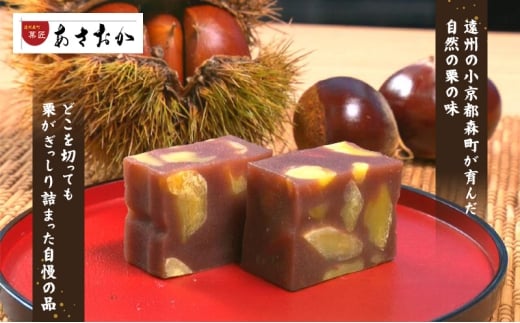 手作業で丁寧に皮を剥いた茹栗を、羊羹の生地にふんだんに練り込み、じっくり蒸し上げました。