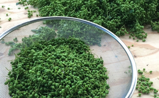 自家栽培の実山椒を緑の香り高い時期に収穫し、オリーブと合わせ、山椒のピリっとした風味を味わえる逸品です。料理の仕上げにひとふり入れるだけで素材の旨味を引立て口の中に山椒の香り・辛みが広がります。