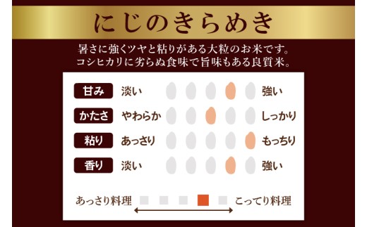 特 徴 … にじのきらめきは暑さに強くツヤと粘りがある大粒のお米です。
