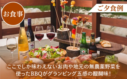 プライベートデッキにて、ここでしか味わえないお肉や地元の無農薬野菜をふんだんに使ったBBQが