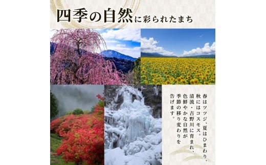 吉野川市は、美しい清流「四国三郎」吉野川に育まれ、ホタルやツツジの大群生など四季折々の豊かな自然が息づいています。また、誇りある歴史と伝統、文化を受け継ぎながら「世代を越えて夢紡ぐまちー新・生活創造都市をめざしてー」を市の将来像とし、さらなる飛躍を目指しています。