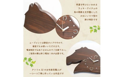 - 馬蹄 の 掛け時計 ブラウン 木製 時計 馬 掛時計 鹿毛 静音 木工品 家具 インテリア 木 静岡県 藤枝市
