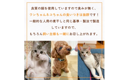 一般的な人用の煮干しと同じ基準・製法で製造していますので、もちろん飼い主様も一緒にお召し上がれます。