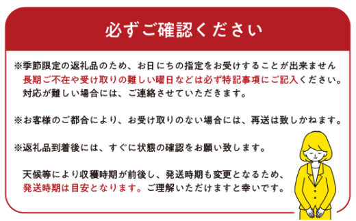 2025年10月以降順次発送 ■配送について ※お届け期間内に長期のご不在などございましたら、備考欄にご記入ください。 ※事前連絡をいただいていない転居や長期ご不在等、お客様都合によってお受け取りができなかった場合の再送は致しかねます。 ※台風等の自然災害などの影響で、万が一手配ができない際には、品種の変更や翌年度への繰り越し等お願いする場合がございます。 |